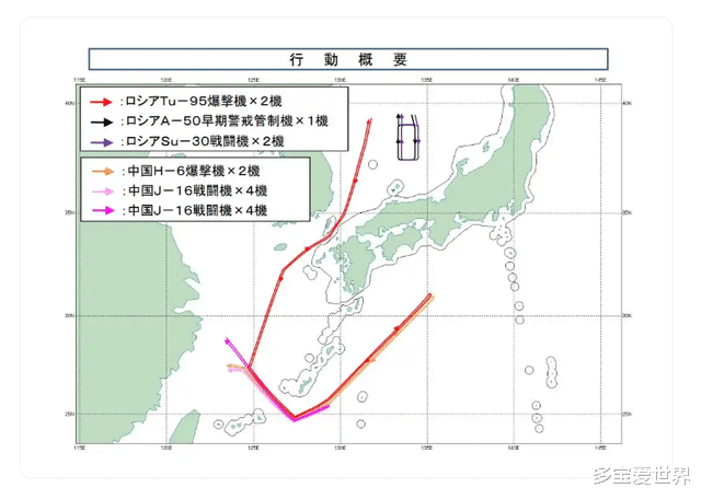 先说说这次联合巡航的硬核配置。俄方出动 2 架图 - 95 轰炸机、1 架 A-50 预警机,还有 2 架苏 - 30 系列战斗机。咱们中方也不含糊,派出 2 架轰 - 6K 轰炸机和 8 架歼 - 16 战斗机,阵容相当豪华。飞行路线更是不一般。当地时间 9 号下午,俄轰炸机编队先穿过对马海峡进入东海,和咱们的战机编队汇合后,一起经宫古海峡闯进西太平洋,接着一路北上,越过北纬 30° 线和东经 135° 线,直接飞到了四国以东空域。